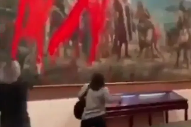 Dos activistas del movimiento climático Futuro Vegetal lanzaron este domingo pintura roja biodegradable sobre el cuadro Primer homenaje a Cristóbal Colón, de José Garnelo, en el Museo Naval de Madrid. La acción, realizada en plena Fiesta Nacional de España, buscó denunciar lo que califican como “neocolonialismo extractivista” y exigir justicia histórica para los pueblos originarios.