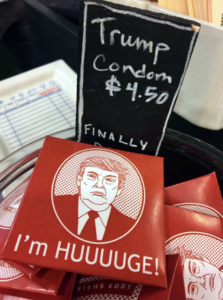 En una de las imágenes aparece el actual mandatario estadounidense rodeado de seis mujeres, cuyos rostros fueron tapados, en una aparente fiesta de estilo hawaiano. En otra de las fotos se ven diversos sobres de condones con el rostro de Trump y la frase: “I am huuge” (“soy enorme”).
