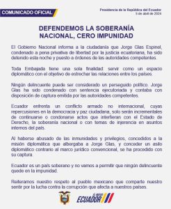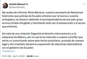 El presidente Andrés Manuel López Obrador denunció una «invasión de la embajada mexicana» en Ecuador por parte de la policía ecuatoriana.