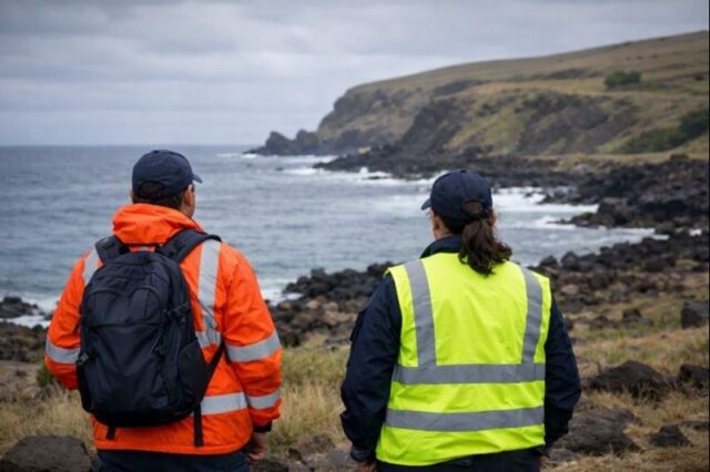 Las condiciones geográficas de Rapa Nui complican las labores. El terreno volcánico y las marejadas obligan a extremar precauciones. Aun así, el operativo se mantiene activo sin interrupciones.