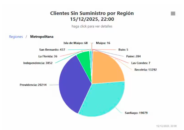 Según la Superintendencia de Seguridad y Combustibles (SEC), a las 22 horas de este lunes, «un total de 57.442 clientes se encontraban sin suministro en la región: de ellos, 20.214 corresponden a Providencia, 19.079 a Santiago y 13.292 a Recoleta», sin que hasta ahora se conozcan las causas del apagón.