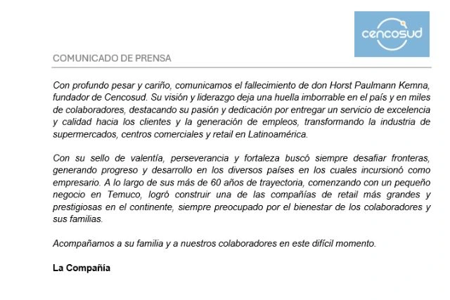 «Don Horst Paulmann, presidente de Cencosud S.A., durante los últimos días, se ha encontrado realizando diversos exámenes médicos. En virtud de ello ha solicitado una licencia médica que lo mantendrá alejado de sus periódicas actividades en la compañía durante el mes de febrero en curso», febrero del 2021. Internado en la Clínica Las Condes.