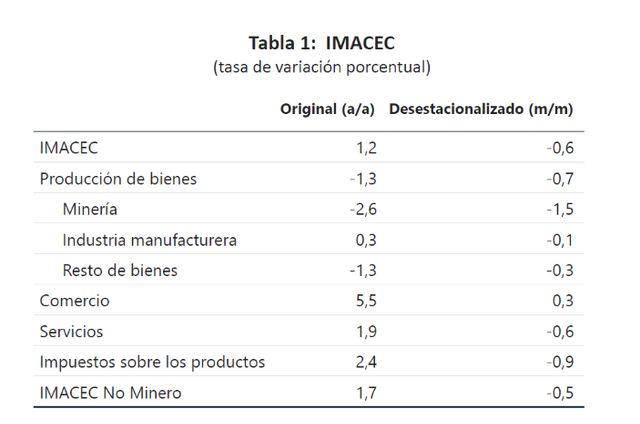 Además, el Imacec desestacionalizado registró una caída de 0,6% respecto al mes anterior.