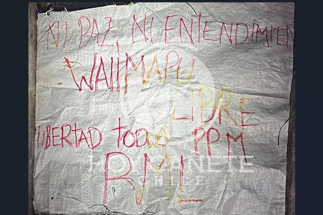 Antes de escapar, los desconocidos dejaron un lienzo con un mensaje firmado por la agrupación. El texto decía: “Ni paz ni entendimiento. Wallmapu libre. Libertad a todos los PPM (presos políticos mapuche). RML.”