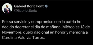 Este martes, el Presidente de la República, Gabriel Boric, decretó día de duelo nacional por el fallecimiento de la exsubsecretaria de Relaciones Exteriores, Carolina Valdivia.
