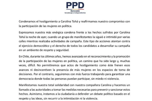 «En Chile que tenemos que construir entre todos, es un Chile sin violencia, y por eso condena de manera categórica la violencia y la agresión que recibió ayer Carolina Tohá, así como la violencia y agresión que reciben muchas personas todos los días en distintos lugares de Chile. El Chile que tenemos que construir es sin violencia donde las diferencias las podamos expresar en un ambiente democrático y pacifico».