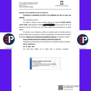 incumplimiento y a la circunstancia que el imputado se ha presentado a las actuaciones del procedimiento, por lo que se accede a lo solicitado y en consecuencia se repone la resolución de fecha 9 del presente mes y año y se tiene presente el nuevo domicilio del imputado ANTONIO WILLIAM JALAFF SANZ en el período que comprende entre el 12 de septiembre al 21 de septiembre del año en curso, ambas fechas inclusive”. (Ver FOTO)