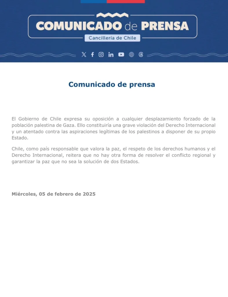 La Cancillería de Chile a través de un comunicado emitido este martes, manifestó su rechazo a cualquier forma de desplazamiento forzado de la población palestina en Gaza.