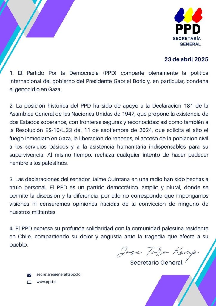En tanto, el Partido Por la Democracia (PPD), a través de un comunicado aseguró que «el partido comparte plenamente la política internacional del gobierno del Presidente Gabriel Boric y, en particular, condena el genocidio en Gaza».