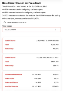 19:38 Cuarto cómputo: Con 83,43% de las mesas escrutadas Kast obtiene 58,61% y Jara 41,39%.