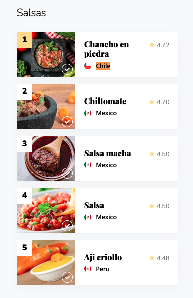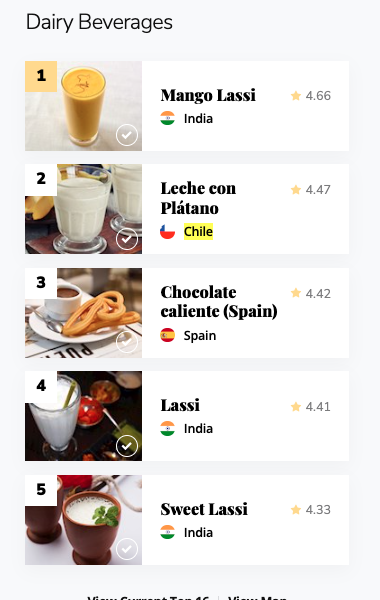 En el segundo lugar de las bebidas láctea se encuentra la «Leche con Plátano»; y en especias y condimentos el «Merkén» también se llevó un segundo lugar mundial.