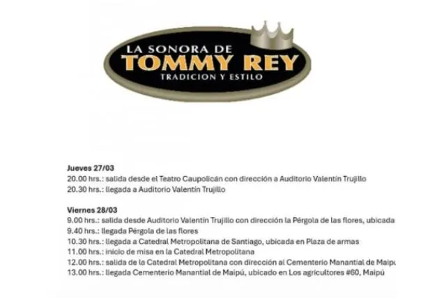 Tras la ceremonia, el cortejo se dirigirá al Cementerio Manantial de Maipú, donde se realizará el último adiós al histórico líder de la Sonora de Tommy Rey.
