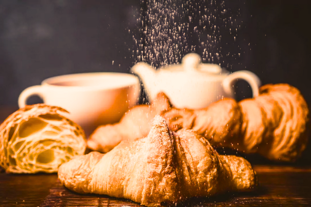 El croissant se elabora con masa hojaldrada, que se consigue alternando capas de masa y mantequilla. Durante el horneado, la mantequilla se derrite y genera vapor, creando una textura ligera, crujiente por fuera y aireada por dentro.