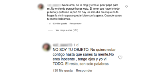 En otro comentario, agregó: «No entiendo por qué haces esto. El tener que hacerlo todo público y quitarme la paz. No hay un solo día en el que no te hagas la víctima para quedar bien con la gente. Cuando sanes tu mente hablamos».