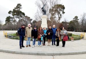 A continuación, la lluvia y el frío no fueron impedimento para realizar un recorrido literario por el parque madrileño de El Retiro, en compañía del grupo poético de Aranjuez, “Poetas en el paisaje”, y en este escenario abierto, con el paraguas de telón, Montserrat Doucet, Ángel de Marco, Juani Martínez, Aurelio Campos y Ángel Justo Cámara, compartieron sus versos con los integrantes del Encuentro, venidos desde distintos puntos de España y América.